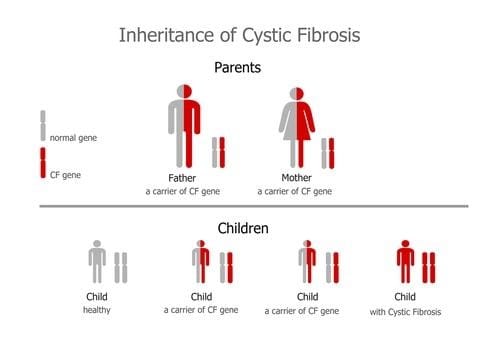 Inheriting two copies of the mutated CFTR gene, one from each parent, results in the child having CF. [2]