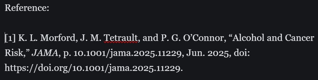A systematic review reported by the National Academies of Sciences, Engineering, and Medicine (NASEM) in 2025 included 23 cohort and 2 case-control studies, published between 2010 and 2014. These studies focused on low to moderate alcohol consumption effects and found: