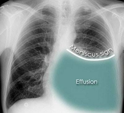 Chest X-ray: A meniscus sign on an upright posteroanterior chest X-ray is indicative of pleural fluid exceeding 200ml. Blunting of the costophrenic angle is also seen on the X-ray.