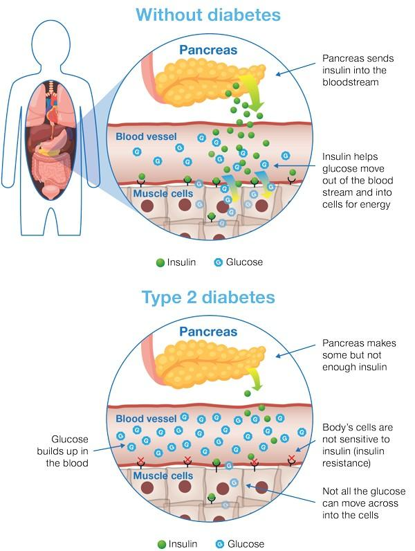 T2D happens because pancreas doesn’t make enough hormone called insulin, or body doesn’t use insulin properly, or both. This is different from type 1 diabetes, which happens when an autoimmune attack on pancreas results in a total lack of insulin production.